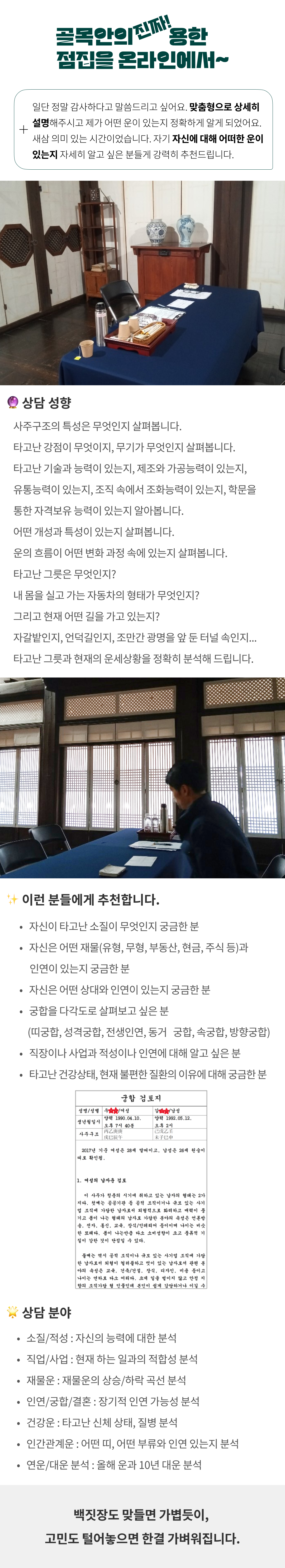 • 상담사가 개인 거래를 요구하는 경우, 즉시 골목점집 고객센터에 신고부탁드립니다.