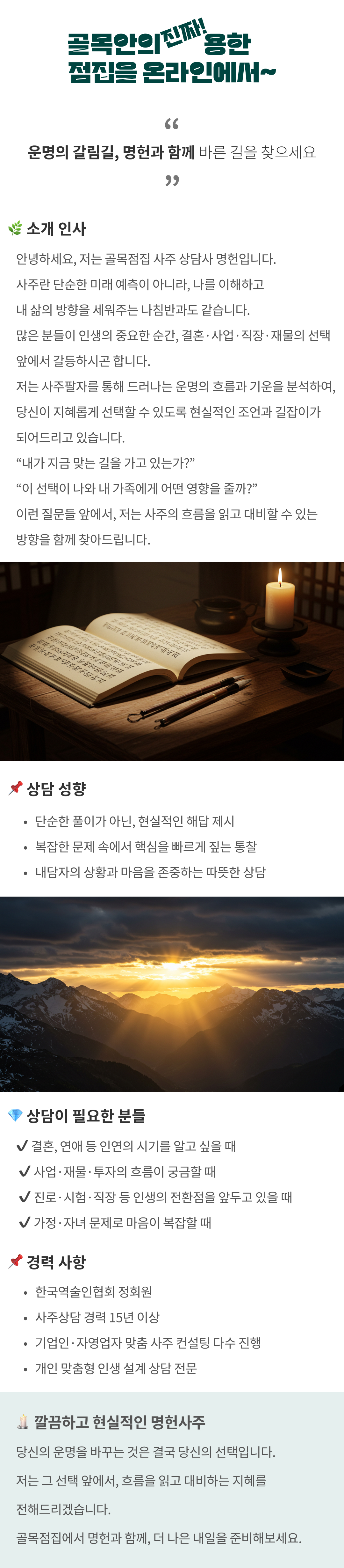 • 상담사가 개인 거래를 요구하는 경우, 즉시 골목점집 고객센터에 신고부탁드립니다.